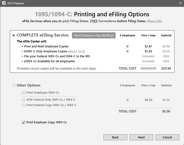 A: Yes, the Aatrix ACA Complete eFile Service can print and mail employee copies and eFile the required reports to the IRS at a discounted rate. To qualify for discounted 1095s, follow the steps below: