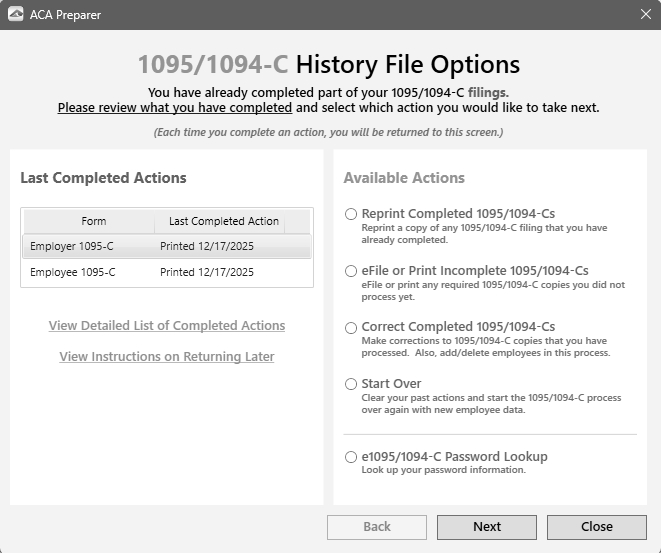 Note: The example below is for the 1094/1095-C forms, if you are processing the 1094/1095-B forms the screens that display may appear slightly different.