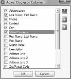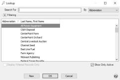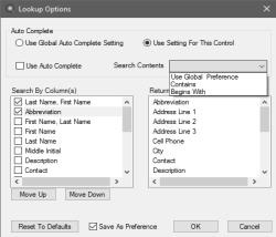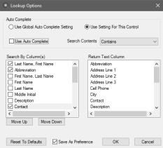 Several custom lookup options are available for any field containing a Lookup button. The options will allow you to specify which fields to search for matches and how the information will be displayed. To access the Lookup Options, right-click in any Lookup field and select Options.