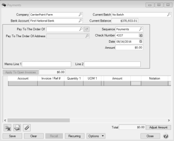 - The current date is assigned and if applicable, the check number is incremented based on its numbering sequence. Make any needed modifications to the transaction.