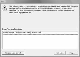 This is an example of what the W-2/1099 Preparer will display if it finds incorrect or missing data. If this screen is displayed, simply click on the Go Back and Correct button and the data that needs to be corrected will be displayed in red. Click on the red data and correct the information. Once all data has been corrected, click Next Step again to continue to the next screen.
