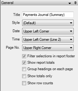 - General tab: Manages the title and style of the report and the position of the date, time stamp, and page numbers.