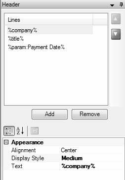 - At the top of the screen in the Lines area, click on the header information that you'd like to change (Company/Fund, Title, etc.) and the Appearance information for that line will display below.