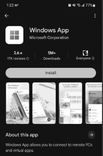 - From the App Store on your Android device, search for the Windows App app. The developer is Microsoft Corporation.
