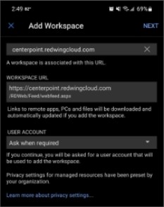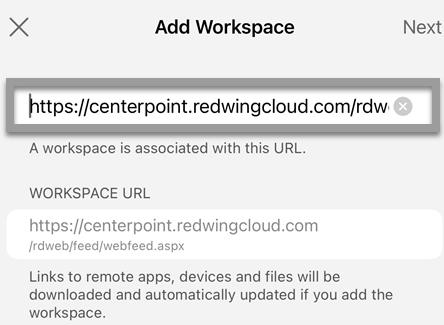 - In the Workspace URL box, enter https://centerpoint.redwingcloud.com/rdweb/feed/webfeed.aspx and select Next.