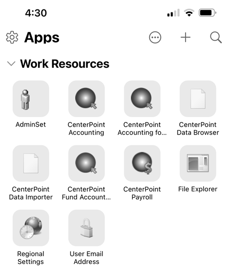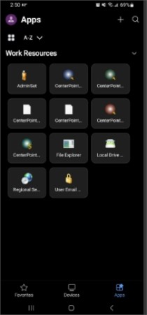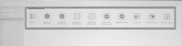 - You should see your Work Resources (AdminSet (if applicable to your cloud profile), CenterPoint, File Explorer, and other applicable applications) loaded on the Apps screen.