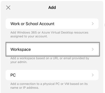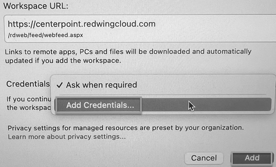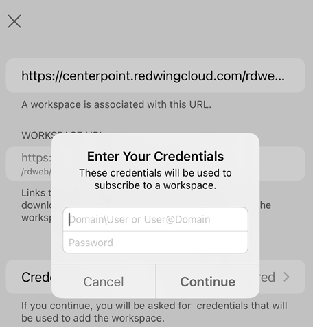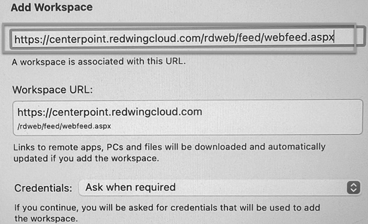 - On the Add Workspace screen, enter the https://centerpoint.redwingcloud.com/rdweb/feed/webfeed.aspx URL.
