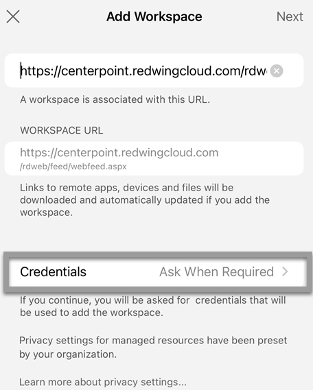 - On the Add Workspace screen, select Credentials and switch the selection from Ask when required to Add Credentials (unless you prefer to log in each time you open the app and/or Workspaces).