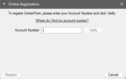 - On the Online Registration screen, enter your company Account Number and then click Verify. Click the Where do I find my account number? link for examples on locating your account number. Click here to see an example. If the Account Number is invalid, a The Account Number entered is not valid. Please try again or contact Red Wing Software for assistance. message will display. If an invalid account number is entered three successive times, no further attempts can be made for 10 minutes or until CenterPoint is restarted.