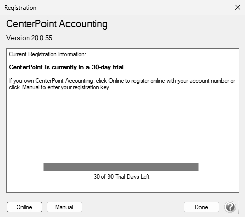 When CenterPoint is installed, it will be in a 30 day demo mode until the software is registered. The first time CenterPoint is opened, you will be prompted to register the software. The registration key provides you with a license for the products you have purchased.