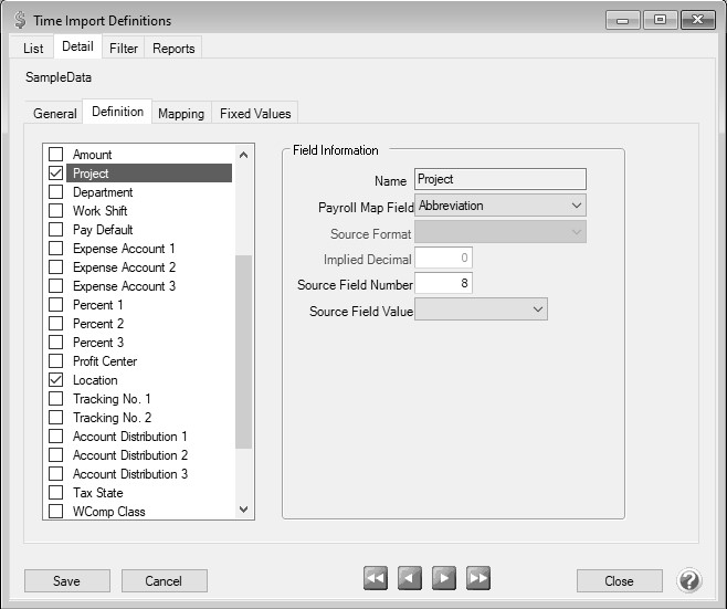- Source Field Number - Available for Delimited file formats. Enter the field or column number for this item in your import file. For example, if Employee is the 2nd field in your import file, enter 2.