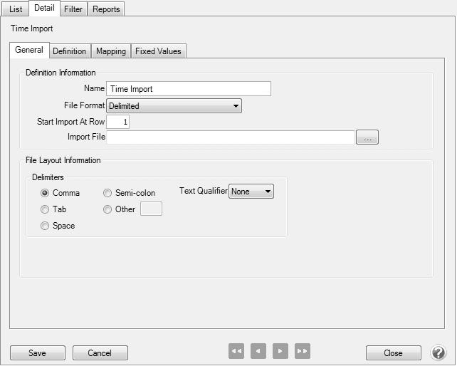 You can define a Fixed Width, Fixed Width Random Access, or Delimited file format for the definition file. On the Definition tab, you set up the mapping definitions so the records from the source file will import into CenterPoint time sheets correctly. There are some differences in the way you enter your mapping definitions depending on the file format.
