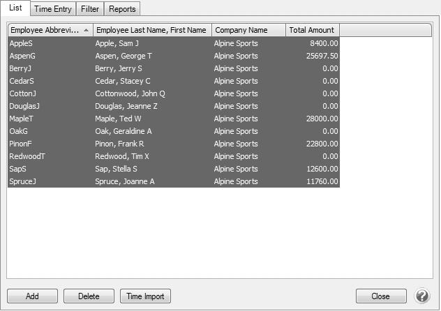 - Select the employees you wish to delete time from. Multiple employees can be selected by holding the Ctrl key on your keyboard while you click. To select all employees, highlight the first name on the list, hold the Shift key and select the last name.