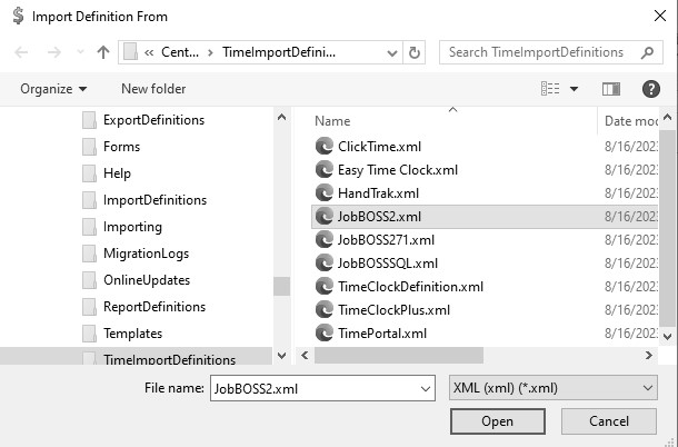 - Select the Definition you wish to import and click Open. If you are using JobBOSS2 and your employee codes have 3-digits, select JobBOSS2. If your employee codes have 4-digits select JobBOSS271. If you are importing a different file, select the location on your computer where that file is saved.