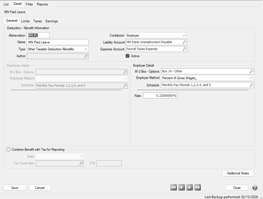 2. Select the Combine Benefit with Tax for Reporting check box if you are an employer that pays some or all of an employee benefit. The employer benefit amount will be combined with the employer tax amount for state-specific tax reporting in Federal & /State Payroll Forms & Reports (Aatrix). For example, see the Minnesota Paid Leave document for more information.