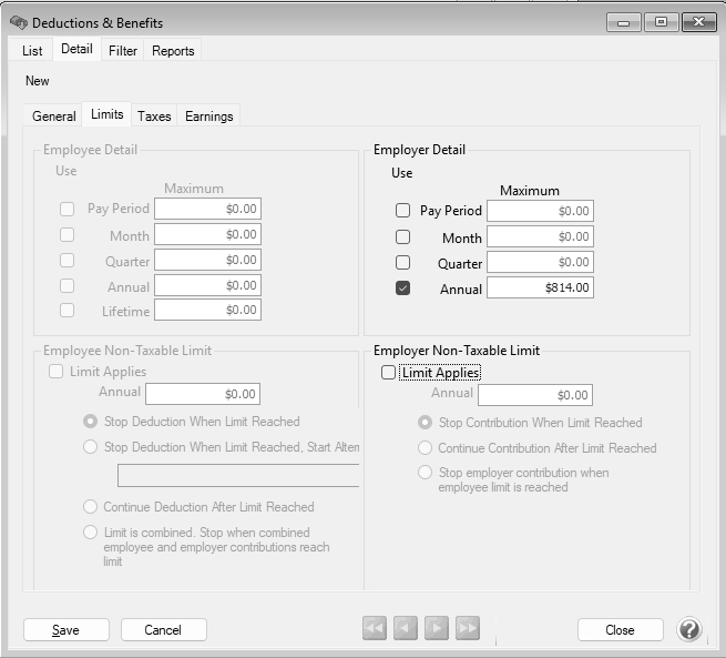 - Select the Limits tab, select the Annual check box and enter the limit. (This is the tax calculation amount limit, not the wage limit. To calculate the limit, multiply the wage limit by the Rate on the General tab. For example, in 2026 if you are paying the full employee portion, the calculation would be $185,000 x .0044 and the limit would be $814.00.)