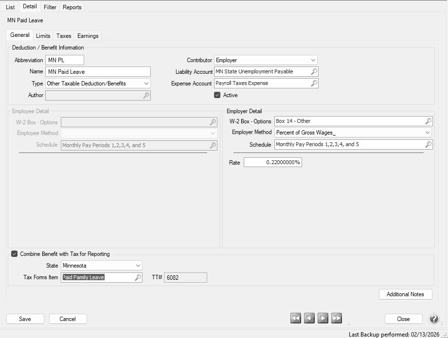 - Select the Combine Benefit with Tax for Reporting check box to combine the MN Paid Leave benefit and MN Paid Leave tax amounts for state tax reporting from Reports > Federal & /State Payroll Forms & Reports (Aatrix).