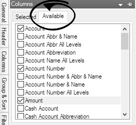 - From the preview of any report, click on the Columns tab. All columns that are available to print on this particular report will be displayed on the Available tab. This list changes for each report.