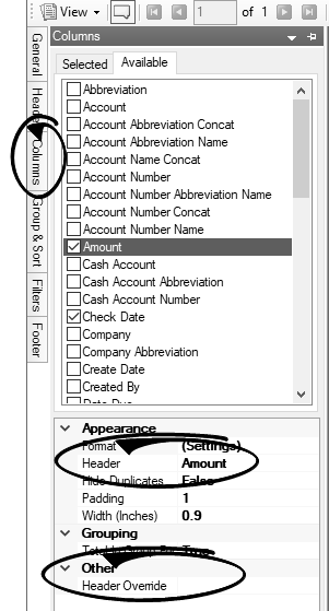 - Columns tab : Select which columns of data do and do not print on the report.
