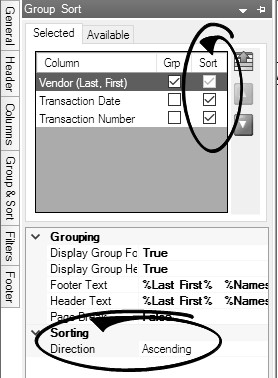 - If you have chosen more than one column to sort on, then the sort order must also be specified. This is done by using the green up and down arrows on the right. In the example above the report would sort by Vendor, Transaction Date, and then Transaction Number.