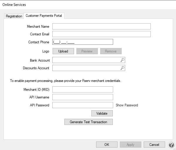 - Select the Bank Account and Discounts Account to use when importing customer payments from the Customer Payments Portal into CenterPoint as receipts. Enter your Merchant ID (MID), API Username, and API Password credentials provided to you by Fiserv for processing credit card payments. Click Validate to verify the credentials are accurate.