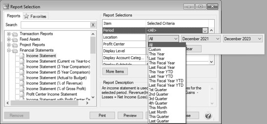- Select the report you want to print/preview. In the example below, the Income Statement report was selected.