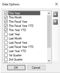 - From the Date Options screen, select the ranges that apply to you. The ranges can be ordered by using the green up/down arrows. Click OK. Once changes are made, they will be saved and re-used anywhere the report filter is used. Each type of filter (Date Range, Period, and Period Range) maintains its own configuration settings.