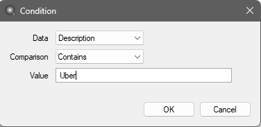 - In the Value box, enter the value the Comparison apples to. In this example, the rule will apply if the Description of any Bank/Institution transaction contains the text "Uber".