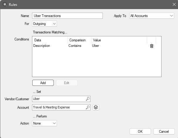 - If you want to set conditions the data must match for the rule to be applied for either the Description or Category, under the Conditions box, click Add.