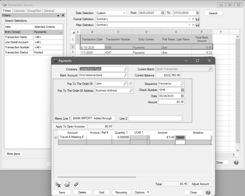 - In the example below, the Entry Screen of Payments and the Date Range of 06/01/25 - 07/01/25 were selected. Two transactions are found in search for Uber.