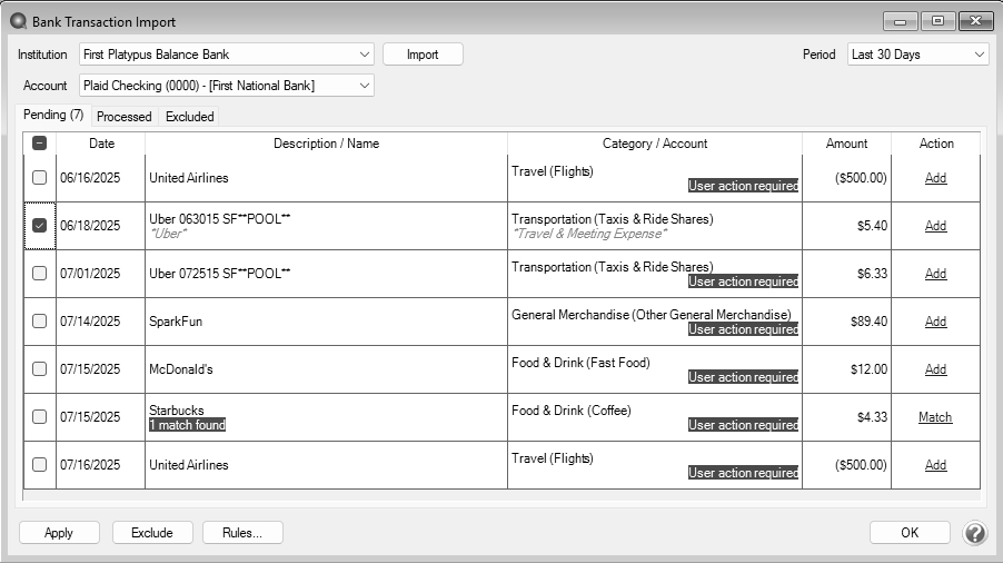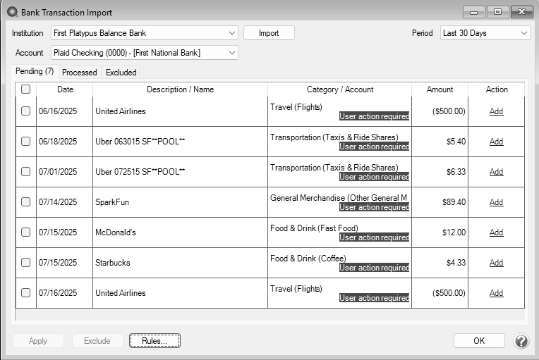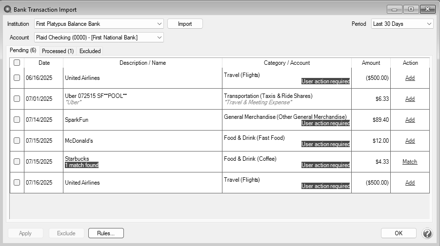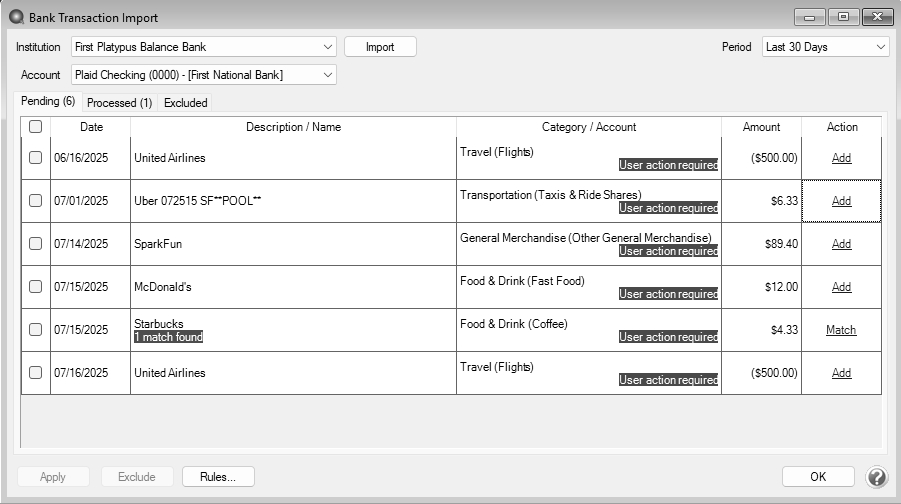 If a pending Bank/Institution transaction needs more information to be added to CenterPoint, a "User action required" message displays in the Category/Account column. The first time you review transactions for a Bank/Institution, all transactions will say “User action required.” This is because no mapping is set up yet. To review/change the action the imported Bank/Institution transaction should take when processed, in the Action column, select the Add, Match, or Exclude link.