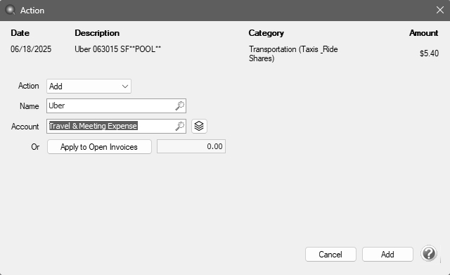 Using the transactions in the example above, the Add link was selected for the 6/18/25 transaction.