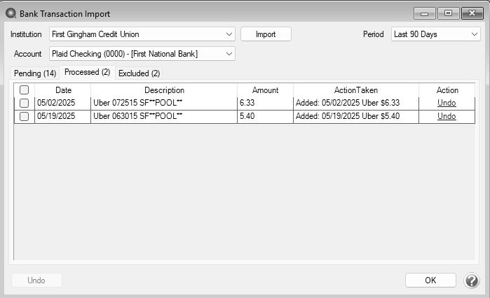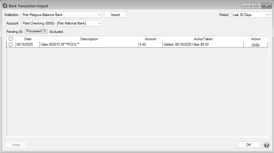 - Click Import. A message indicating the number of transactions imported displays, click OK. You can import on any schedule, but you do need to import at least once every 90 days to keep the link active.