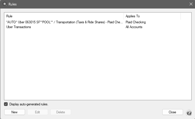 - As you map Bank/Institution transactions, auto-generated rules will continue to be defined. Theses rules can be Edited or Deleted.