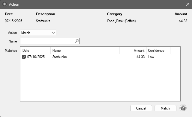 - The process will attempt to match transactions by Name, Transaction Date, and Amount– in that order. Partial matches are also possible. Dates must also match within a period of +/- 3 days.