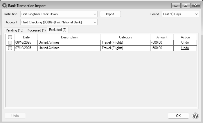 Exclude - This link is used if you do not wish to map or match this Bank/Institution transaction to CenterPoint. Click Exclude to remove it from the Pending tab. You can click Undo to move excluded transactions from the Excluded to the Pending tab.