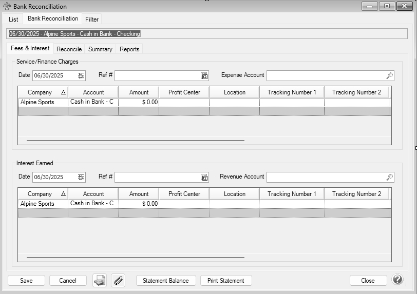 - The Fees & Interest tab will be used to enter any bank fees, service charges and interest income that appear on the bank statement. If no fees were charged or interest earned to this account, skip to Step C.