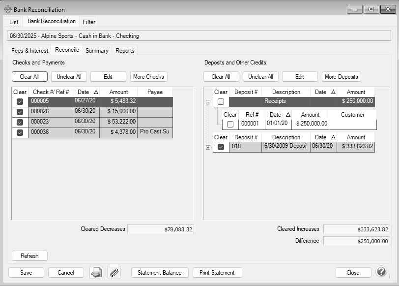 - Verify that the Cleared Increases matches the total deposits cleared on the bank statement.