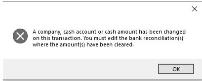 A: If a bank reconciliation with cleared transactions and a difference of zero contains a transaction that was edited (even if it was just a date change), deleted, or voided, the Transactions Removed column will display a Y to identify that a transaction was changed. If a cleared transaction is changed through Transaction Search, the following message displays to identify that the transaction was already cleared and the bank reconciliation should also be changed.