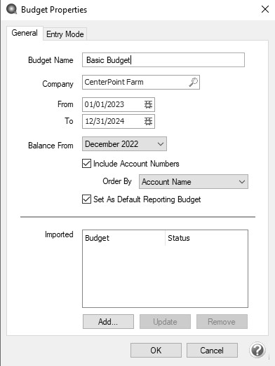 CenterPoint Accounting has a variety of options available in budgeting. These tools can be used to create anything from a basic budget to a budget that does "if - then" computing. In this example, we'll be setting up a budget for revenue and expense accounts but also offsets to cash. This type of a budget will help you track your cash flow flow for the year and assist in planning the need for operating loans.