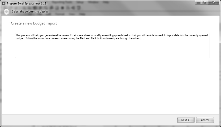 1. Once the blank budget is created, select File > Export/Import Data > Prepare Excel Spreadsheet. A wizard will walk you through each step of the process. Click Next on the Create a new budget import screen.