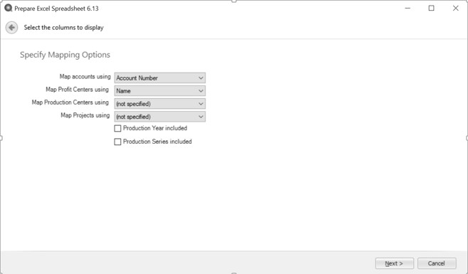2. The Specify Mapping Options screen allows you to determine which information is unique. In our example, our accounts have unique account numbers and our profit centers are unique by name. So, in the Map accounts using box select Account Number and in the Map Profit Centers using box, select Name.