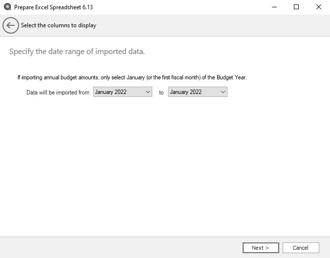 1. Select the date range . If importing annual budget amounts, only select January (or the first fiscal month) of the Budget Year. Although this is normally an entire fiscal or calendar year, any date range may be selected. Normally, these dates would correspond to the dates used when the budget was created. Click Next.