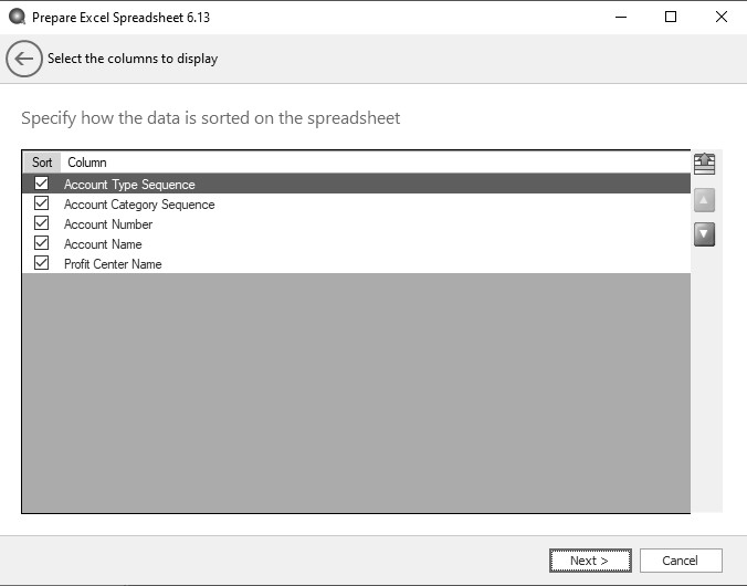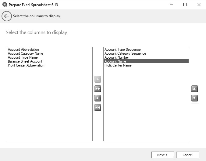 1. In the Select the columns to display screen, specify any additional columns of data you'd like to include in the spreadsheet. When the spreadsheet is created it will be created with a list of accounts down the left-hand side. In our example, that list of accounts will be repeated once for each profit center you select. Since we selected in the Sample Database that the Account Numbers were unique, that is what is going to display for each account. We are going to add the Account Name by moving it to the right- hand side and positioning it under the Account Number. The Up and Down arrows to the right will allow you to adjust the order of the columns. Click Next.