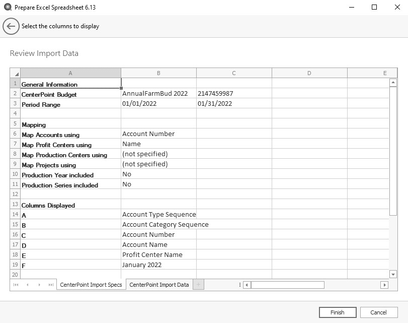 1. The Review Import screen will display the CenterPoint Import Specs tab with the information used to define the import and the CenterPoint Import Data tab with the information that CenterPoint will send to the Excel spreadsheet.
