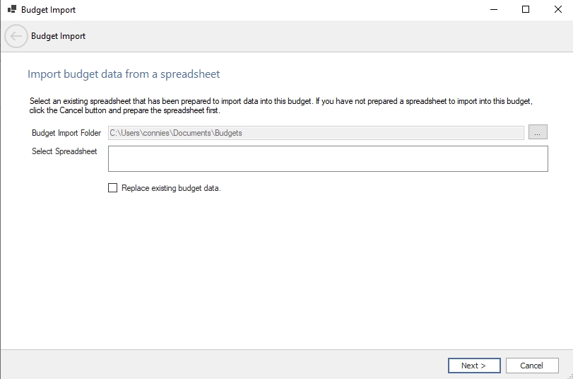 1. .In the Specify the Excel Spreadsheet you wish to use to import data screen, in the Budget Import Folder box, select which folder to store the spreadsheet in. The first time you use the import process, the folder will be your Documents folder. The last folder used will display.