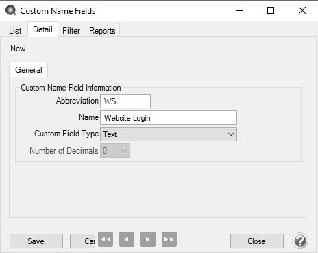 2. Click Save to save the custom name field and return to the List tab, or click Close to save the custom name field and close the Custom Name Fields screen.