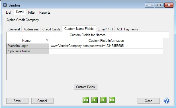 For example, you may want to create a custom name field for a vendor that you make online payments to an account for and you want to store your login id and password information for that vendor’s website on the Custom Name Fields tab or you want track the name of an employee's spouse. You can add the custom name field called "Website Login" or "Spouse's Name" and attach it only to the names, vendors, customers, or employees you want to track the information for.