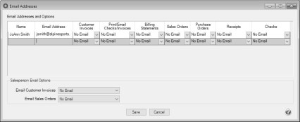 You can optionally add email addresses where messages and attached documents can be sent to; including internal staff, outside accountants, or other addresses that are not related to the name/customer the transaction is entered for. You can also select how each email is to be sent, directly to the recipient, as a carbon copy, or as a blind carbon copy or set a default "From" email address for each document.