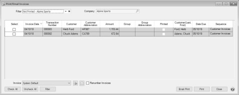 - Click Email/Print to resend and/or reprint all selected invoices or click Print to reprint all selected invoices. Invoices will be reprinted and/or resent based on the selections made for the invoices in Setup > Customers or Setup > Names > Names.